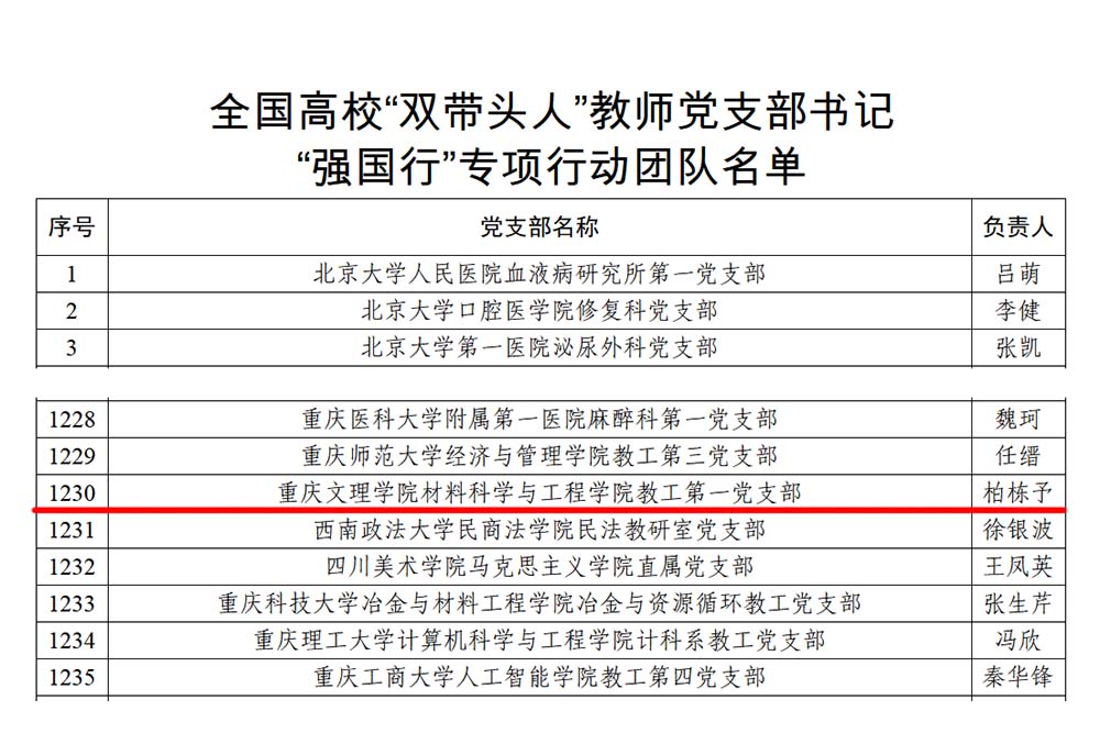 近日,教育部办公厅公布全国首批高校“双带头人”教师党支部书记“强国行”专项行动团队名单,学校材料科学与工程学院教工第一党支部入选,这是学校在国家级党建荣誉上的又一次新突破。